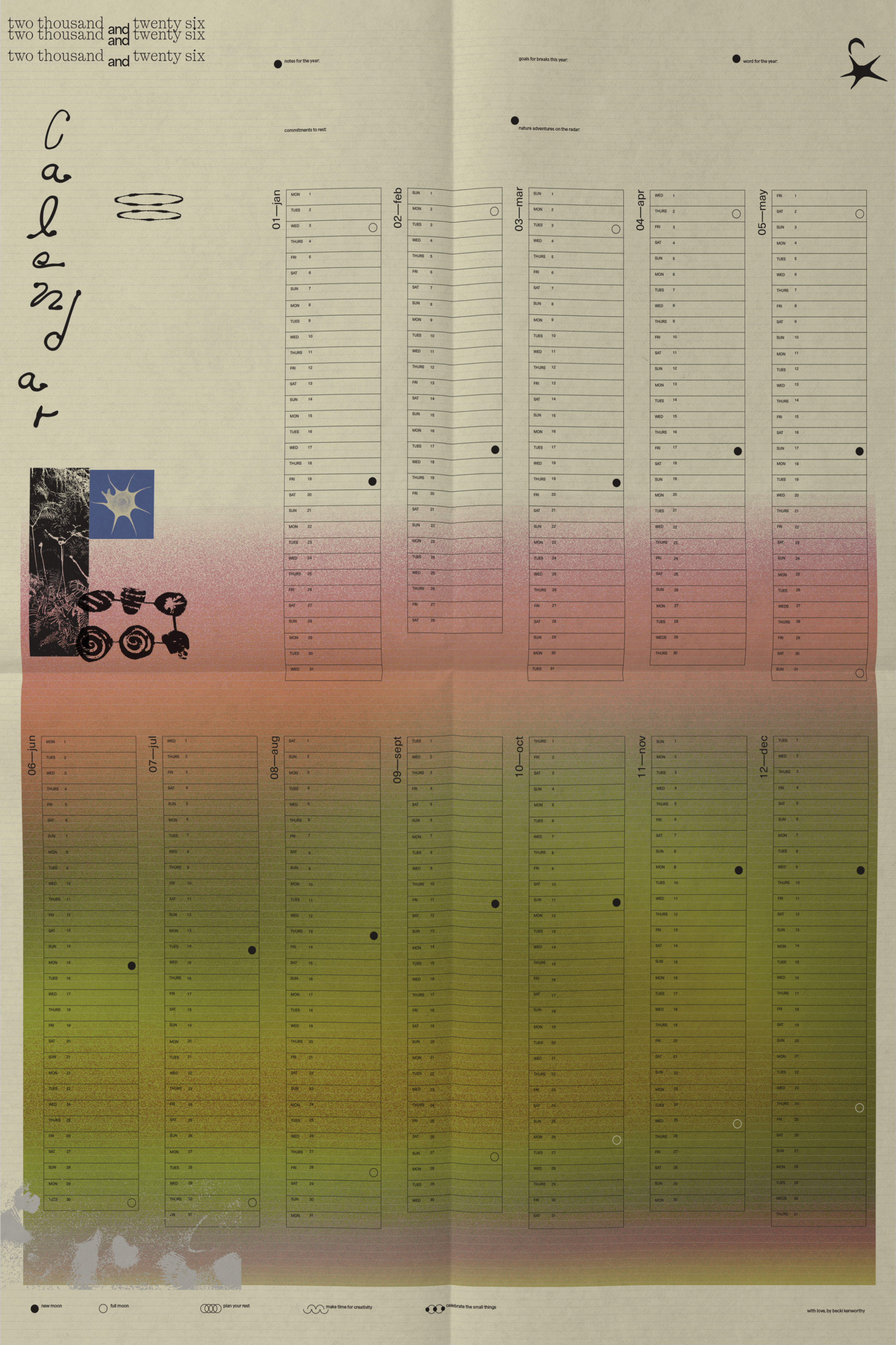 Always a few days late in January but back again nonetheless for my annual free wall calendar. Made to encourage planning time for rest throughout the year. Use as you wish.︎